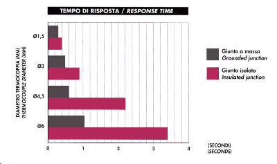 Il grafico seguente mostra il tempo necessario ad una termocoppia con isolamento minerale per il raggiungere il 63,2% del salto termico misurato in acqua con velocità di 0,4m/s